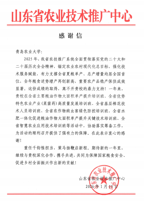 2026年1月15日,山東省農(nóng)業(yè)技術(shù)推廣中心向我校發(fā)來(lái)感謝信,對(duì)我校在2025年全省基層農(nóng)技人員培訓(xùn)工作中協(xié)助落實(shí)籌備工作,為活動(dòng)的順利進(jìn)行提供了強(qiáng)有力的保障表示衷心感謝。信中指出,在全省夏糧單產(chǎn)、總產(chǎn)增量均居全國(guó)首位,全年糧食逆勢(shì)增產(chǎn)再創(chuàng)新高的亮眼成績(jī)背后,凝聚著青島農(nóng)業(yè)大學(xué)在農(nóng)業(yè)人才培養(yǎng)與技術(shù)推廣領(lǐng)域的辛勤付出與重要貢獻(xiàn)。這份沉甸甸的認(rèn)可,正是對(duì)青島農(nóng)業(yè)大學(xué)在過(guò)去一年中,高質(zhì)量承辦2025年全省基層農(nóng)技人員培訓(xùn)項(xiàng)目的最佳肯定。